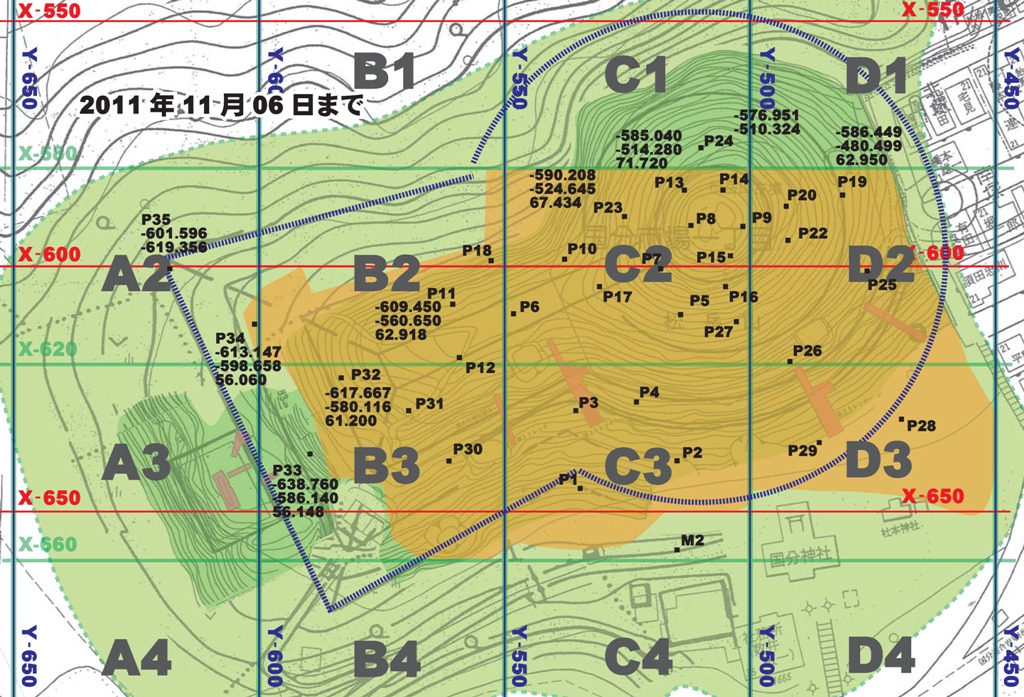 ◆p33にマシンを据え、前方部の削平部を標高58mから56.5mまで下ろす。茶臼塚の手前まで。それから山車小屋の竹藪に突入。小屋の裏側まですべてやりたかったが、午後、学生2人に任