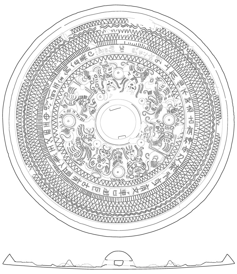 ◆が、そのあと、なぜだかわからん、図面類がどっかいってしまったように思いこんでいて、そのまま放ってあった。で、この夏、「所沢の西田です」とまた電話が入り、まずい!、「ぜったい書きます」と返事。急遽、ところさんに、鏡の写真処理を中断してもらい、三角縁神獣鏡のデジタルトレースをお願いする。で、そこはさすがに早いしうまいもんである。アバウト3日(3週)くらいで上がる。で、お披露目しておく。