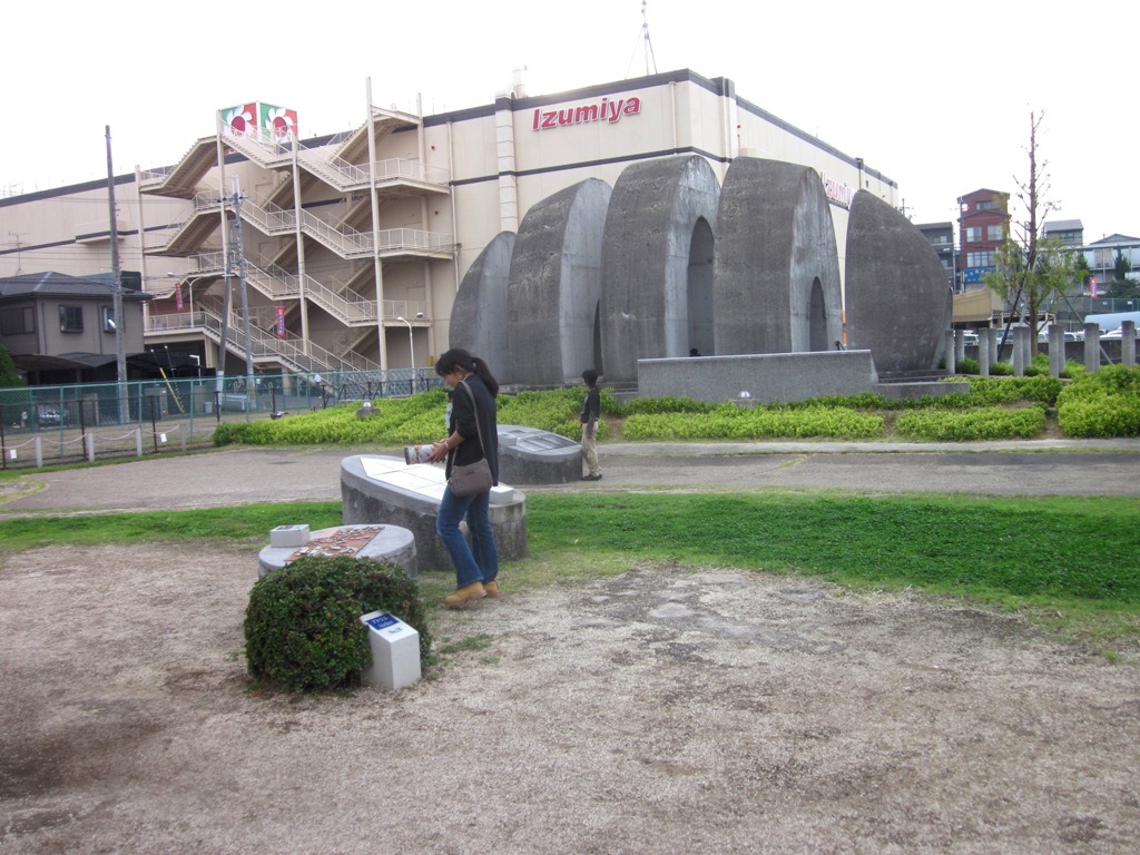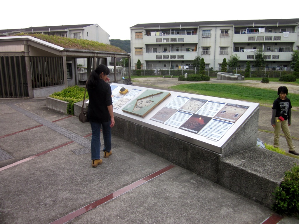 ◆もとは開発予定地だったんでしょうね。それが発掘で旧石器の製作遺跡として希有な出土状況で確認され、保存されたんだろう。【府営住宅だそうです】。サヌカイトの打割をイメージしたモニュメントはじめ、出土状況の模型や展示などがなされてる。史跡指定されていないようだが(府史跡?)、いろいろ保存をめぐってあったのかもしれない。