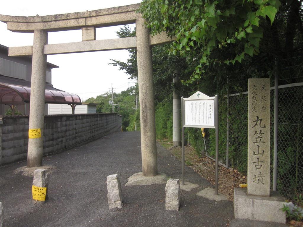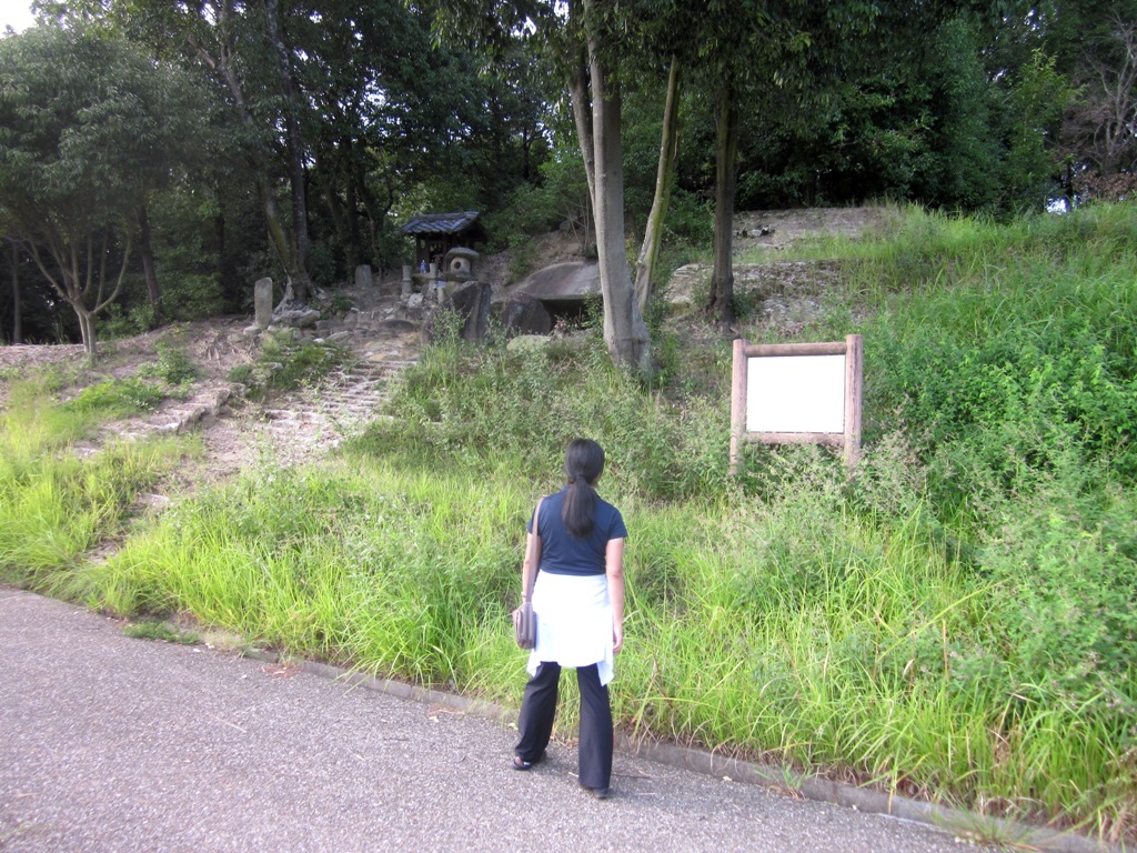 ◆そこから、丸笠山と、もひとつ何とか古墳に行くことにする。丸笠山は、摩湯山の時以来の宿所としていた大阪市立青少年野外活動センターのごく近くにあるのだが、恥ずかしながら行ったことがない。100mくらいの前方後円墳だが、神社があって前方部は削平され、前方後円墳の姿はわからなくなっている。後円部の段築がわかるような図もなく、溜め池にとりまかれているが、これが古墳の周濠なのかどうかも実はよくわかっていない。古墳の裾が汀あるいは池底までおよぶのか、その上部までなのかという問題。