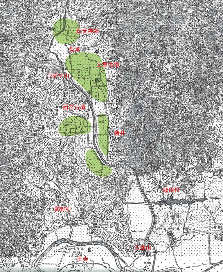 ◆平群谷の明治の地図をコピーし、平野を記入し、古墳を落としてみた。西岸はかなり尾根の出入りがあり、東岸はまとまった平野が連続的に広がっている。