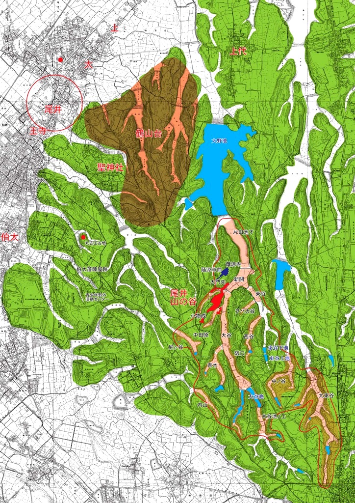 ◆図は、前に上代の調査の時にパワポで作った図と、今回作成した図を示す。大野池の裏にある「山の谷」なんて、知らなかった。明治に入り、聖神社の土地が国有地として召し上げられ、小野なんとかに開発を委ねるが失敗、陸軍が演習林とする。戦後、米軍が入り、日米安保とともに自衛隊前身と共用、現在も、一帯は陸上自衛隊信太山駐屯地として囲い込まれている。朝の5時とか、夜10時とかでもヘリコプターが飛ぶそうだ。協定とか作られてないんかね。ちなみに国有地での耕作地をやめろという裁判が、山の谷や上代に対してあったという。さらに、戦後の演習林の払い下げで、信太は丘陵先端部を希望したようで、そこに住宅公団により鶴山台団地を開発された(これは未確認)。
