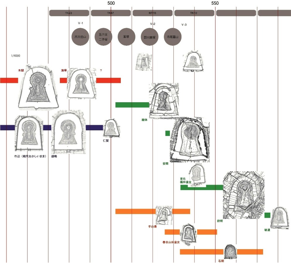 ◆(1)神聖王允恭+執政王反正→(2)反正没(誉田御廟山)→(3)神聖王允恭+執政王イチノベ→(4)允恭没(大仙)→(5)神聖王キナシ+執政王イチノベ→(6)キナシ没?(土師ニサンザイ)→(7)神聖王清寧+執政王イチノベ→(8)イチノベ暗殺(市野山)→(9)神聖王清寧+執政王雄略(キナシとイチノベの前後はどっちがいいんだろう。埴輪チェック、いずれ近似)→(10)雄略没(岡ミサンザイ)→(11)神聖王清寧+執政王仁賢→(12)清寧没(軽里、このへんが問題か。が、清寧墓がほかには見いだしがたい)→(13)神聖王不明(飯豊は?)+執政王仁賢→(14)仁賢没(ボケ山)、継体が統合された倭国王となる(ただし仁賢没にともなうのか、並立したのかは検討の余地あり。)。