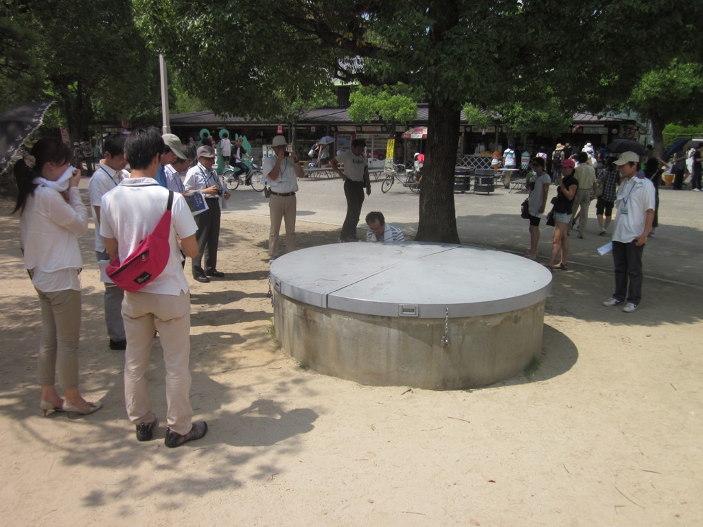 天守閣前の「広場」(天守閣の入場料600円*1000人として=60万円、すごいわ)、円筒形の井戸状のものに蓋をしてある。それがそうなのだ。通常は鍵がかかっている。それを開けてもらったわけだ。