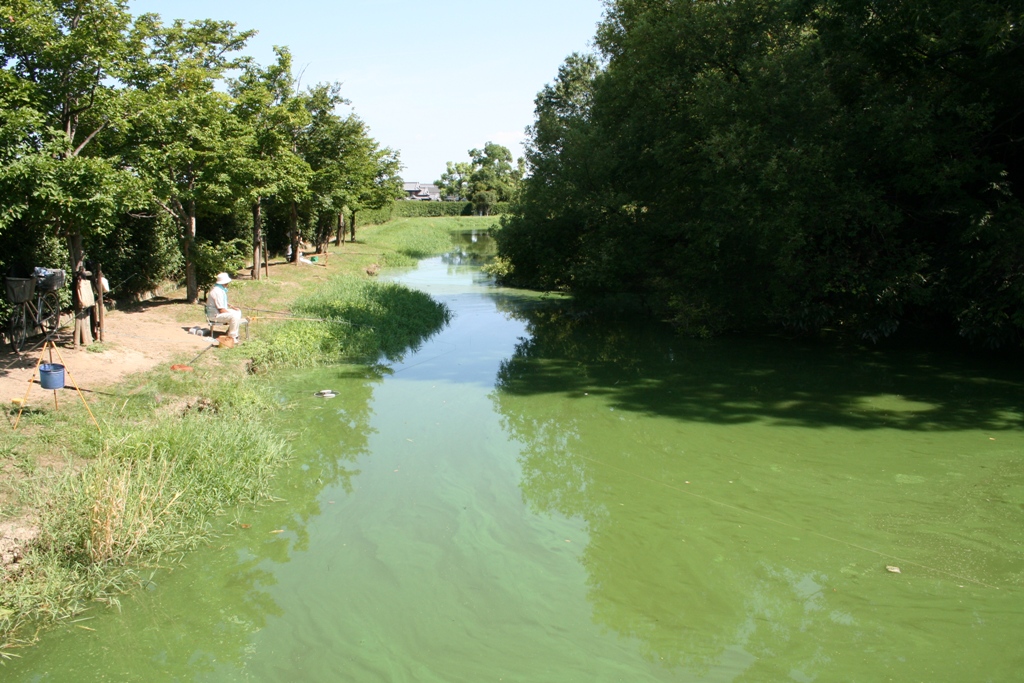 ◆周濠の安全管理の問題からか、常緑樹の植栽がめぐり、堀ばたに立ち入れないようになっている部分もある。そうでないところも、ところどころゲージがあって、基本的には入れないようにしているんだろうが、オープンのところもあって、釣りをしているおじさんたちがならぶ。前方部前面の復元整備したところは草ぼうぼうだった(下)。