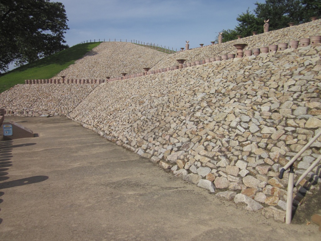 ◆フトン篭は夏場で草が生えて、後円部はあまり目立たないし、その上の植生土嚢は、既に土嚢は破れていたが、垂直でなく墳丘状の斜面ができあがる格好となっており、宮内庁の担当官が言っていたように、確かに景観上はわりと自然な感じに仕上がっている。汀はフトン篭で防御しているが、その上の土壌は次第に流出するだろうから、また先々の問題はあるだろうが、工法も試行錯誤。石垣やコンクリートで固める工法から、フトン篭、洲浜工法など工夫をし、状況で使い分けるようになっている。