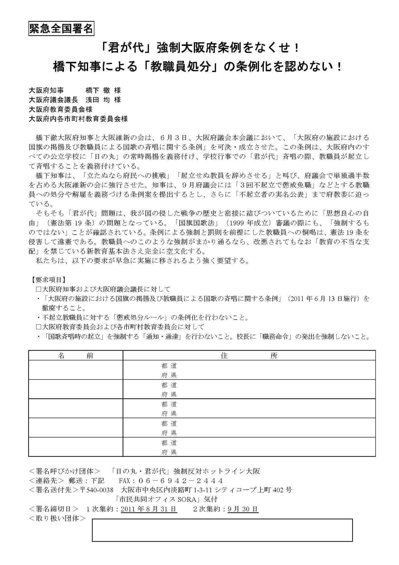 大阪府の君が代条例の撤廃を!