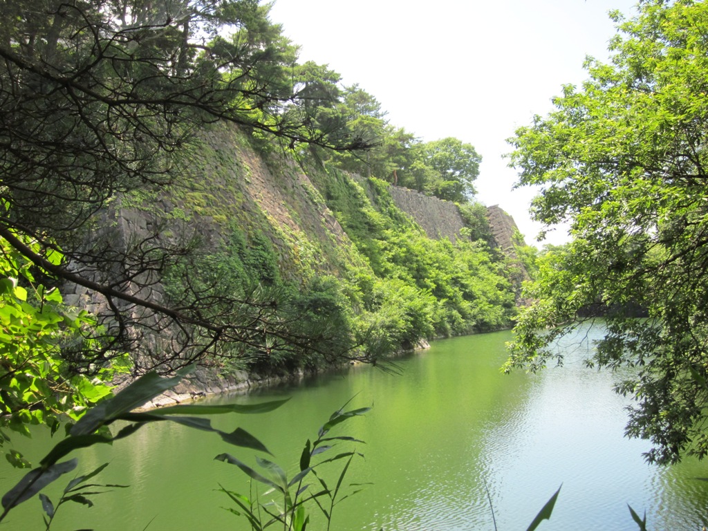◆石垣は確かに高い。「一、二の高さで有名な」という文言はおもしろいですね。その縁回りに安全柵がなく、子供を遊ばせるには怖い。30mともいわれる石垣が堀に落ちている。発掘調査をして石垣を復元している工事も行われている。下に下りて周囲をめぐる。藩校もよく残っ