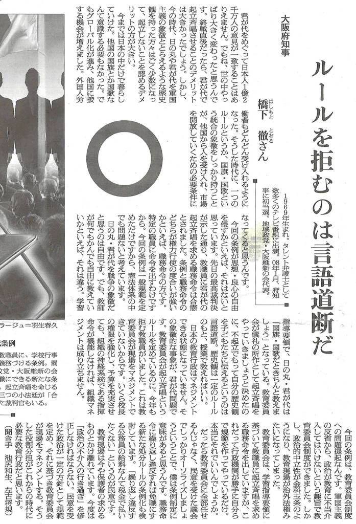 ◆橋下発言で「国歌国旗が軍国主義日本の象徴だったとみる歴史観」といった表現が気になった。が、最高裁判決を見ると、これもまったく同じように出てくるのである。これはなんとかせな。