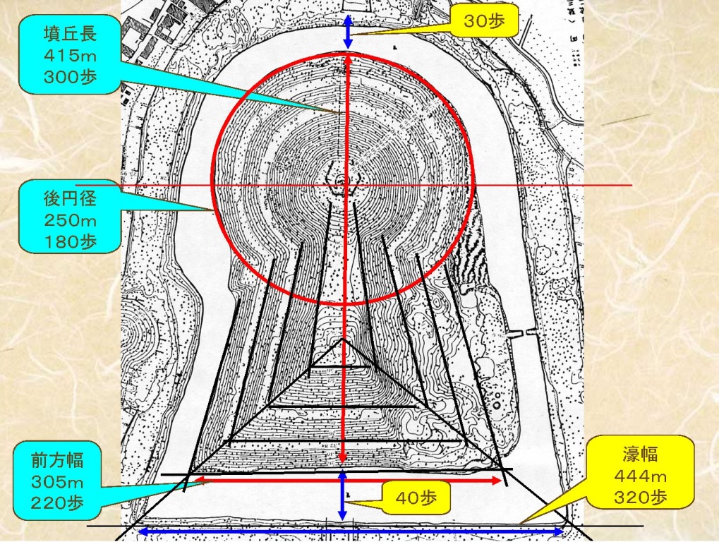 ◆中期に幅のある周堤が完備されるが、陵墓でも堀の肩の部分から内側が宮内庁管理地になっているものが多く、宅地化が進んで保存されていないものが多い。誉田御廟山は堤の外まで宮内庁の管理地となり、これまでよく保存されてきたので、中期古墳の周堤について、本来の姿を確認することができた。しかも幅35歩48m、裾部で約60mの、我が国最大のものである(大仙の上面約30m)。また陵墓図には埴輪列の位置が実は記入されており、埴輪列の幅もわかっている。いまでも樹立状況のわかる埴輪を2カ所で見ることができたし、養生のために土を入れた箇所1カ所を教えてもらった。