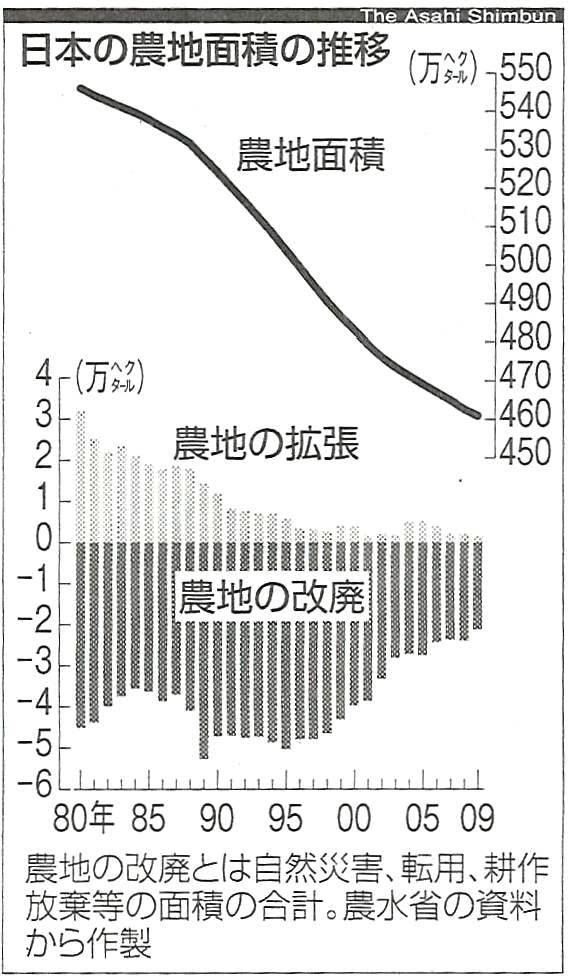 ◆グラフは1980年からだが、農地は1961年には609万haあったが、それが150万ha減ったが、この間に新たに100万haの造成もしているので、1961年時点の農地からは250万haが失われたのだという。