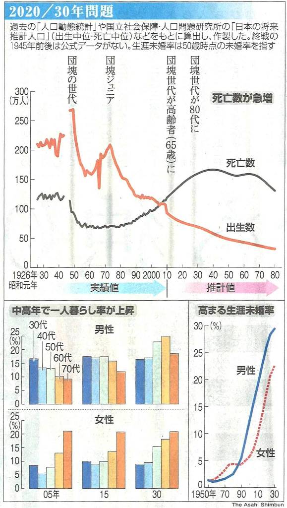 ◆戦後のベビーブーム、いわゆる団塊の世代、そして団塊ジュニアというピーク、こうしたいびつな突出は変えられないし、全体に出生率が落ちていくこともまた必然。高齢者が激増していくことも仕方ない。だが、いまの若い人たち、それから同世代の者、やや上の団塊世代、それぞれ孤独をいかに少なくするか、それは何らかの手を打たねばならないだろう。人口バランスが悪かろうと、医療費・年金問題があろうと、それは構造的な必然であるわけだが、だからこそ弱い1人1人を孤立させない、相互に寄り添える社会をいかに実現するか、結婚という形に限らず様々なコミュニティー、なにがしかの集団に帰属して生きることのできる社会、そういうものを知恵を出して創り出さなければならないだろう。