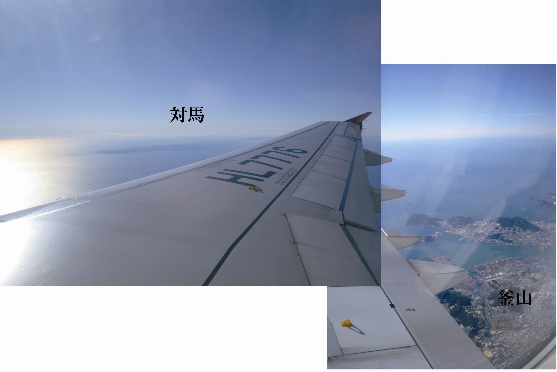 見ていた。金海空港を離陸した飛行機が、一旦、釜山上空に移動し、東三洞遺跡のあるなんとか島が見えてきて、「ああ昔、バスで行った、その先端はたぶんテジョンデといって、天気がよければ対馬が見える」という話だったということを思い出していた。で、後部の窓から釜山を名残惜しく見ていた目を、前方の窓に移したら、すぐに対馬の島影が見えたのでびっくりした。いかに近いか・・・を実感した。