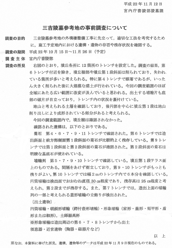 ◆これからも宮内庁の調査において、むろん堀までをカバーしている陵墓の場合は別だが、宮内庁の管理地が墳丘のみの参考地の場合など、地元が同時に調査を実施するようなことが慣例化していくのが望ましいであろう。学会ができることは限られているが、文化庁や地元の自治体に働きかけていく、ということはできるはずである。