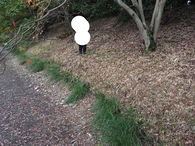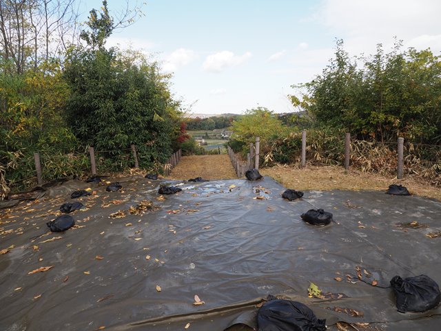 ◆写真は中堤の外側である。手前は第3濠。堤の斜面が2段になって