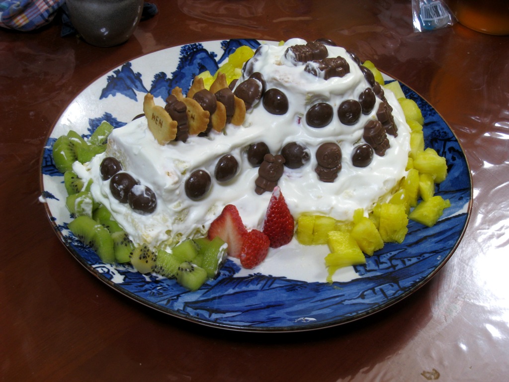 ◆それから前日の21日、帰ると、前方後円墳ケーキが作ってあった。これで3年目である。スポンジを3段にしたのだそうな。年々、凝ってくる。カミサ