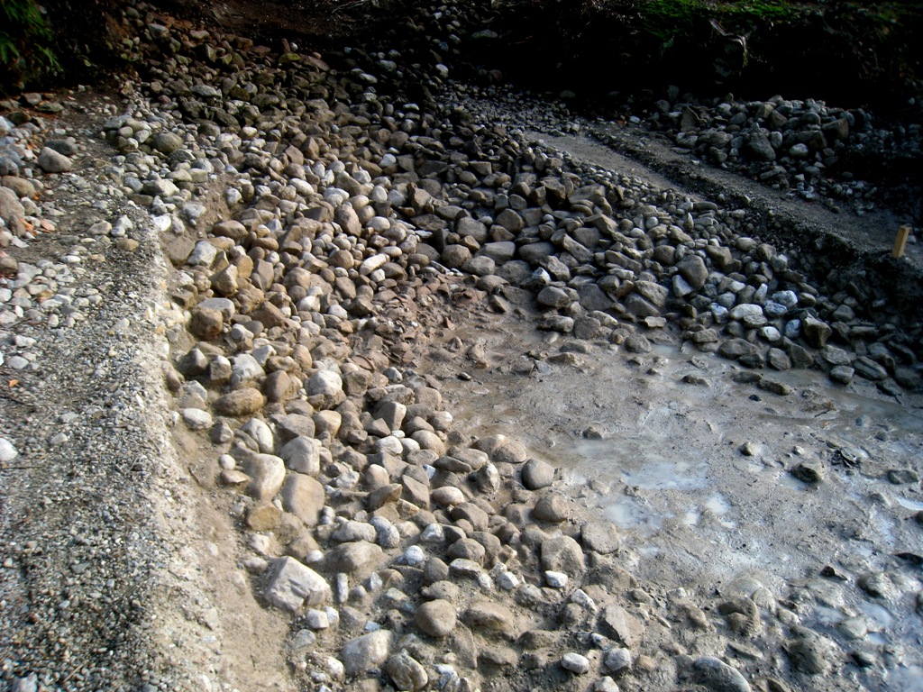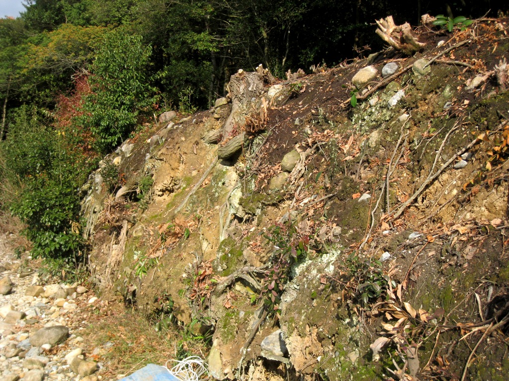 ない手当、とうのでなく。そうすると、やはり墳端を確かめた上で、再度盛り土をした上で、護岸をどうするか。葺石風でない石積みでもよいのではないか。花崗岩で面をきちんとし、面を墳丘斜面にあわせて積む、人工的だが、上までとせず水面の部分とし、むしろまぎらわしくないようにしては。
