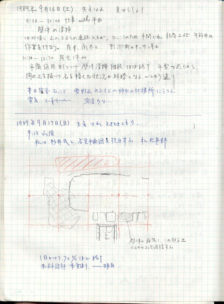 ◆で、都出先生のお誘いで、雪野山の調査に行くことになりました。当時のファイルを見ると、初日は9月13日でした。自分の日誌は10月はじめで途切れているけれど、10月中旬か下旬まではいて、先生から「一段落したし、修論を書け」と言われ、京都に戻りました。あの年、わたしと北條さんの2人は、春と秋、二つの前期古墳の埋葬施設の調査に携わったわけです。