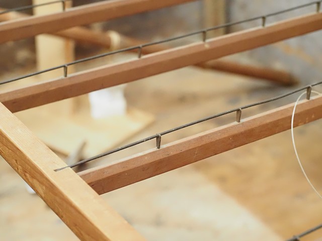 ◆桁の桟に金属線を打ち付けた「つく」というものがある、のだ。そのための鋲というのか、Y字の金具であったり、その他必要な金具を作る鍛冶屋さんがいたとのことで、その動画が面白かった。が、そんな金属線、越前では見てないぞ、と。で、次に行った用具ミュージアムで写真を撮らせてもらった。