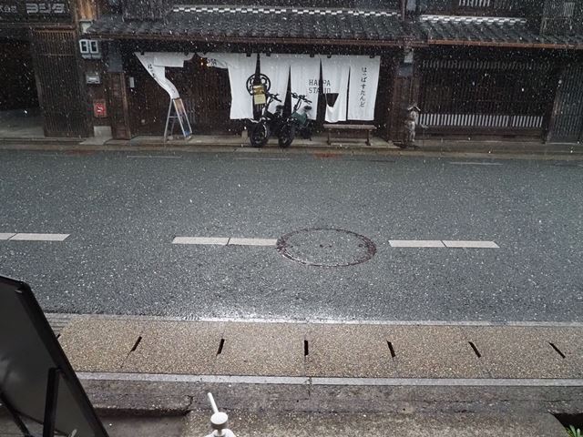 ◆しかし空は真っ黒で、雨が降ってくる。コーヒーも飲める「紙遊」という店に入り、やりすごす。トイレに入っていると、すごい音がしてきて、店の方でも騒ぎ始める。そう、雹が降ってきた!。あわてて飛び出しカメラを構えるも、ピークは過ぎ、シャッターチャンスをのがす。
