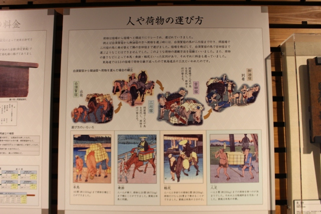 ◆この「豊橋市二川宿本陣資料館」の展示がよかった。東海道53次の宿場町で、同じような展示施設はほかにもあるのだろうし、それを知らないのではあるが・・・。平易でわかりやすく、図等もよくできたパネルがならぶ。伝馬という制度について 説明があり、公的な荷物などは馬・人足により、宿場ごとにリレーされ、隣