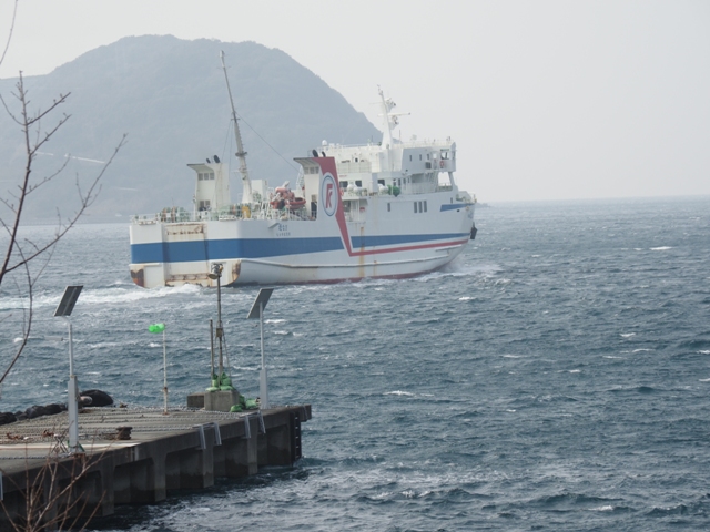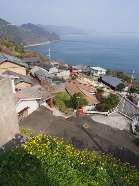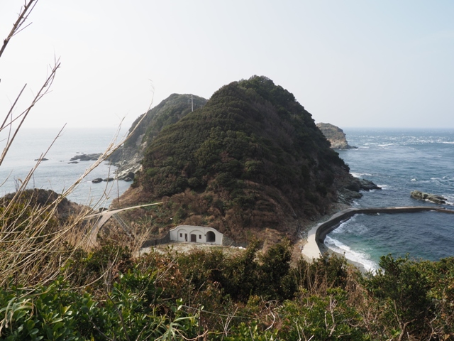 く伸び、最西端となる。手前の駐車場に車を停め、山の北側をまわる遊歩道で先端に進んだところからの写真である。ここからいったん下り、見えているのが椿山というもので、再び上り。さらにその先に御籠島があり(横にちょこっと見えている者)、いまは地続きになっている。