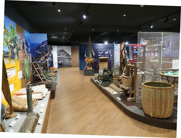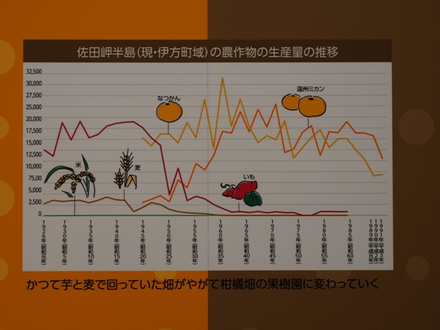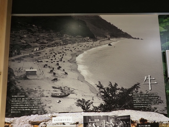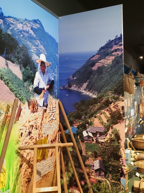 ◆農業。昔の段々畑の写真が美しい。縦写真の画像は展示パネルだが、こんな急傾斜地に畑が開かれている。ここで主に芋、そして麦を作っていた。それが右のグラフのように、戦後ミカン畑になる。なお、漁業のところに海藻取りの画像があり、ガイドさんがこれは肥料にしたんです、と。乾燥させて砕き、それを畑の肥料として鋤き込んでいたらしい。アイスランドでは、岩盤に海藻を敷いてやはり芋を植えていたのだったか?。